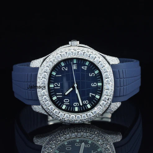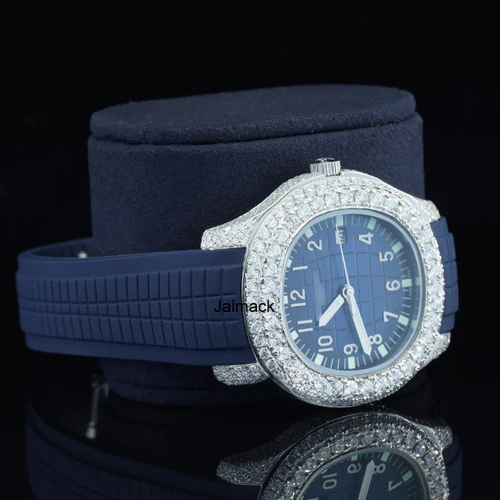 Iced Out Luxury Moissanite Diamond Automatic Blue Rubber belt Watch, Customized Moissanite Studded Rubber belt Watch