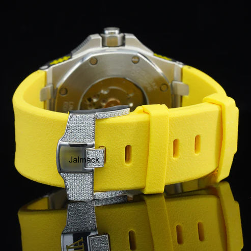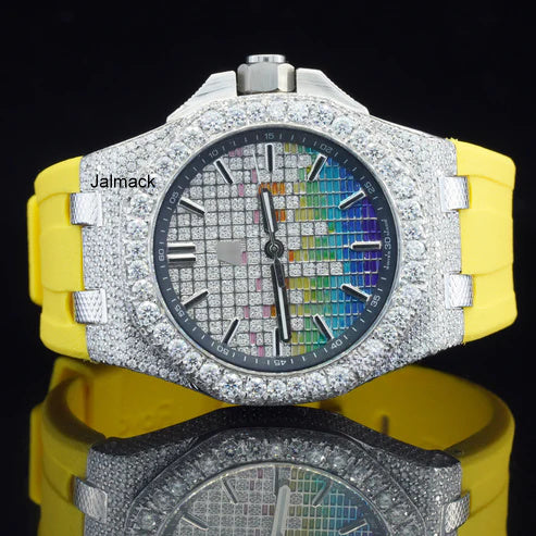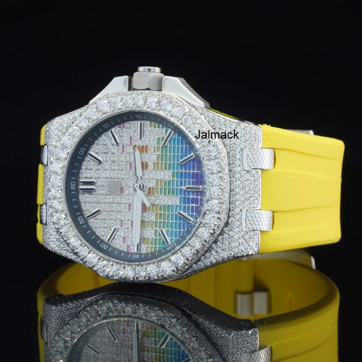 Stainless Steel Iced Out Moissanite Diamond Automatic Rubber Belt Watch, Customized Moissanite Studded Rubber belt Watch